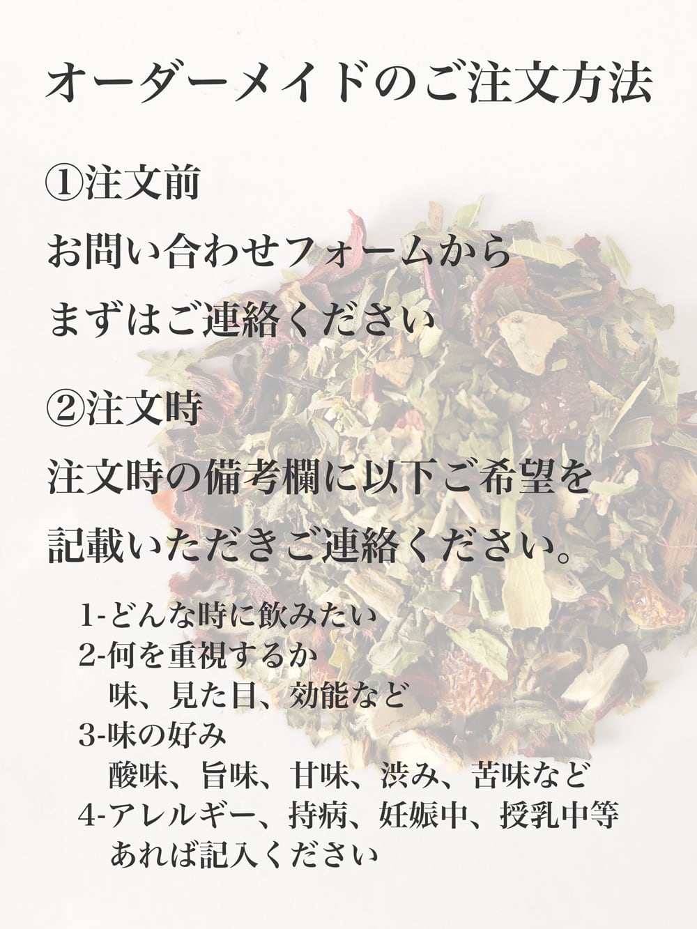 お客様のお悩みやご希望を受けてからオーダーメイドでブレンドしたオリジナルのハーブティーをお作り致します。